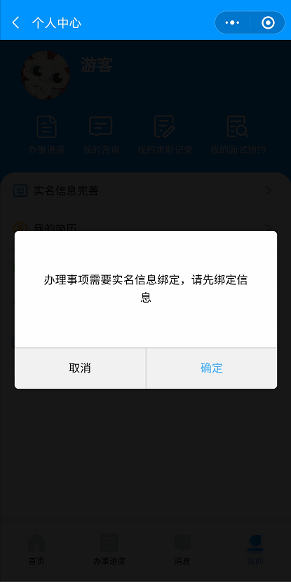01进入小程序,点击个人就业服务,提示绑定个人微信,点击确定前往注册页面,选择个人就业服务