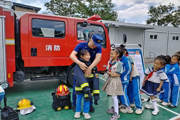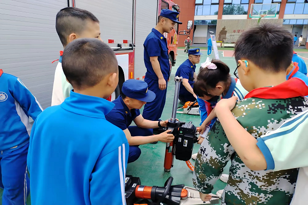 实战演练提能力。液压剪扩器、避火服等专业装备亮相操场,消防员讲解器材用途,邀请学生试穿救援服、操作水枪射水。