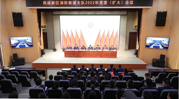 2月25日下午,西咸新区消防救援支队2022年党委(扩大)会议隆重召开。全区消防救援人员、政府专职消防员、文员参加会议。