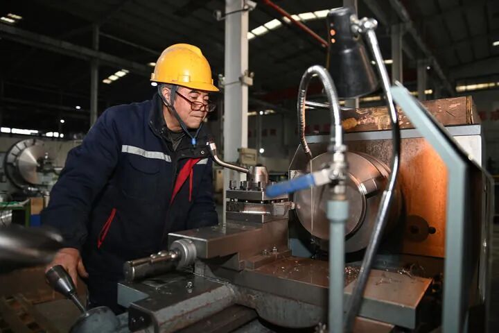 | 2025年1月7日,在宝鸡市永盛泰钛业有限公司机加车间,工人操作车床加工高速压缩机叶轮钛合金锻件。新华社记者 李一博 摄 |
