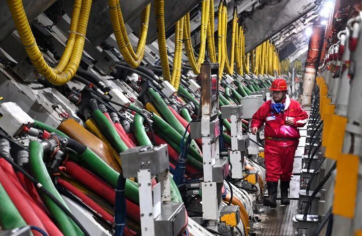 | 工作人员在位于榆林市的陕西陕煤曹家滩矿业有限公司全自动液压支架支撑的采煤工作面巡检(2024年2月29日摄)。新华社记者 邹竞一 摄 |
