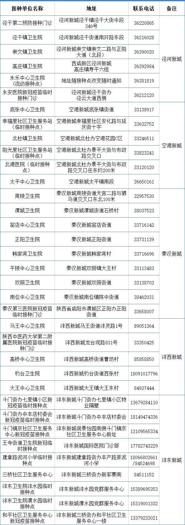 西咸新区新冠疫苗接种单位基本信息表