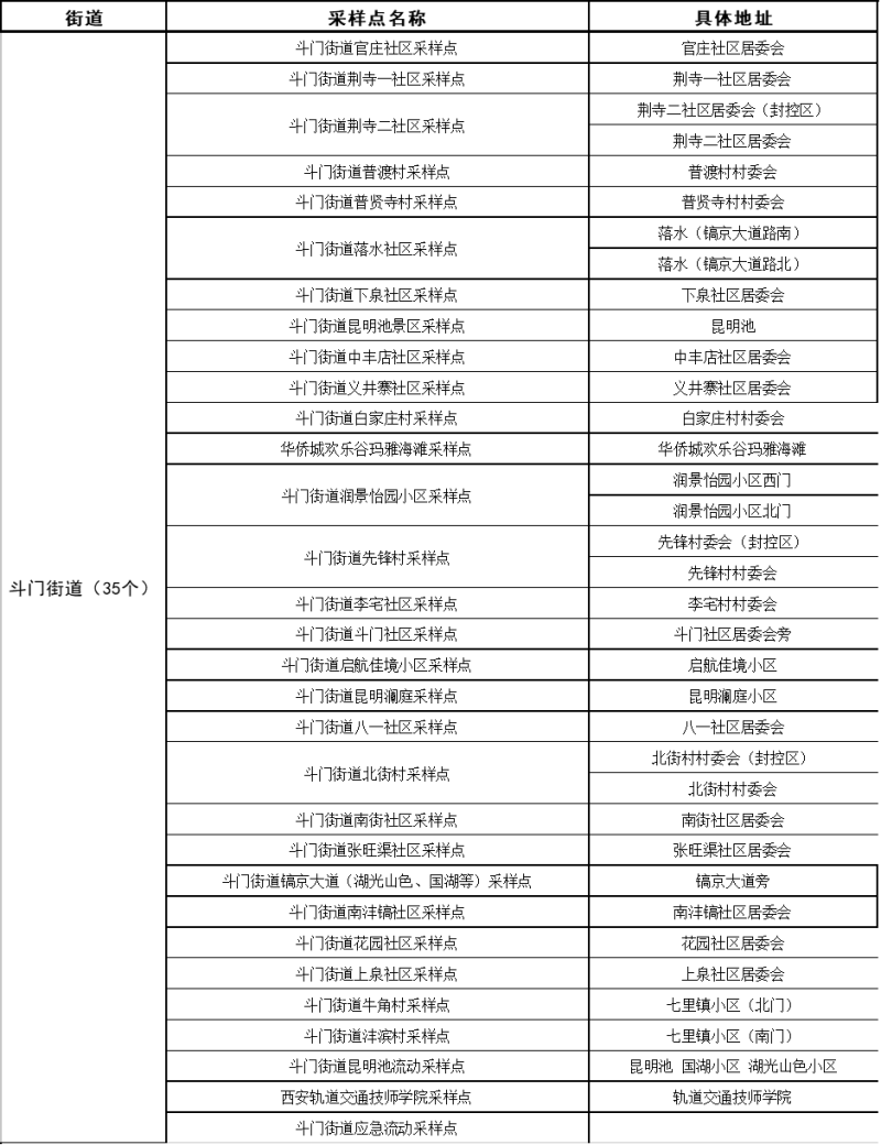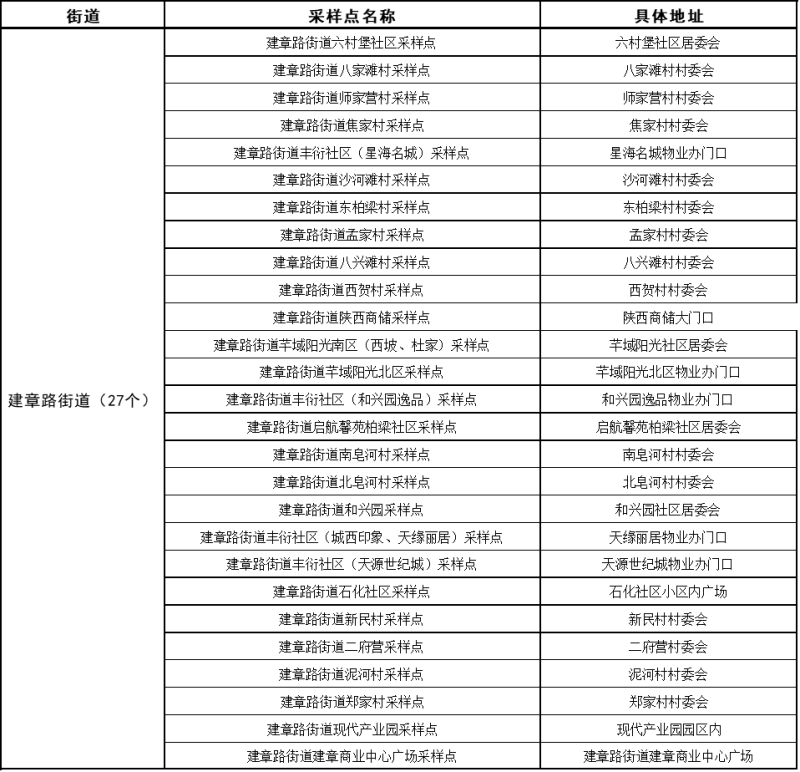 核酸检测采样点及具体时间安排以各街道办事处、社区(村)、单位通知为准,根据检测需求可能进行调整,请居民群众留意街道、社区(村)通知,或拨打新区咨询服务电话了解最新采样点信息。具体地点详见后附表格。