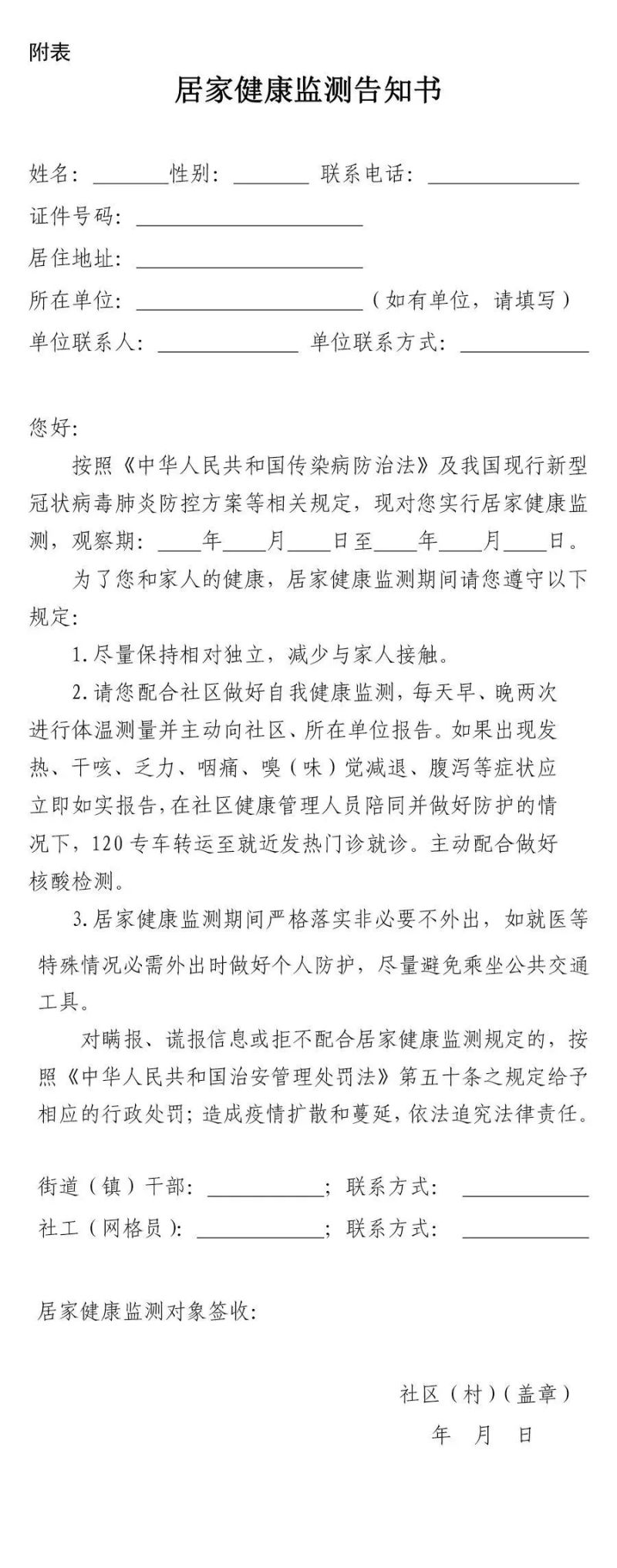 1.登记造册。街道(镇)、社区(村)工作人员要加强摸排和信息登记,及时掌握返回属地居家健康监测的人员信息,及时与居家健康监测人员取得联系,进行信息核实,通过下发居家健康监测告知书(参见附表),告知居家健康监测相关要求,并按照“一户一档”或“一人一档”要求,登记造册,纳入社区网格化管理。掌握空巢独居老年人、有基础性疾病患者、孕产妇、血液透析患者等居家健康监测特殊人员情况,建立台账,做好必要的生活保障和关爱服务。街道(镇)、社区(村)可通过告知书、一封信及微信等方式加强居家健康监测宣教和指导,提醒社区需居家健康监测人员应主动与社区取得联系,及时报备,督促其按要求做好居家健康监测。