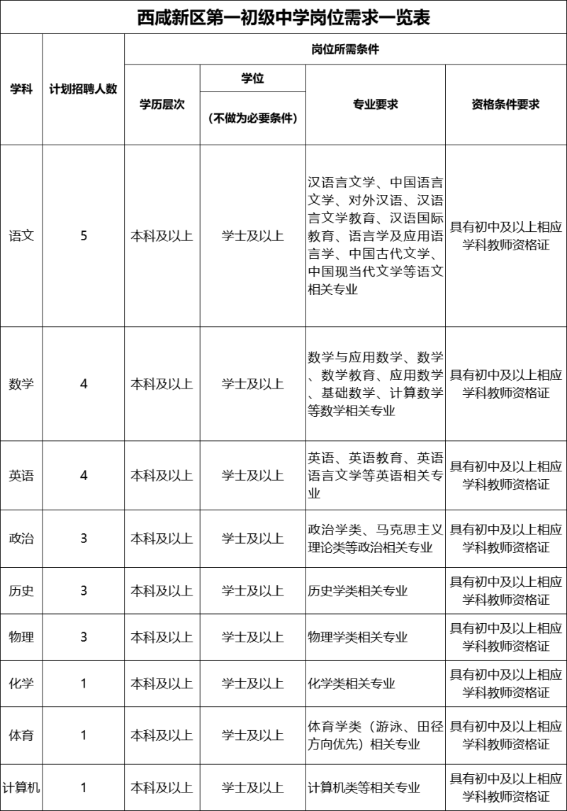 4.应聘教师须为本科及以上学历;应聘学科须与应聘教师本科或者研究生期间所学专业相对应或为相关专业;应聘教师必须持有初级中学及以上教师资格证,且专业与所报考的学科一致;