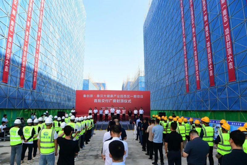 8月31日上午,随着塔吊完成最后一吊斗混凝土浇筑,西咸新区·秦汉大健康产业园西区一期顺利实现首批厂房封顶,标志着项目建设取得阶段性成果。