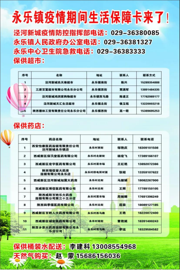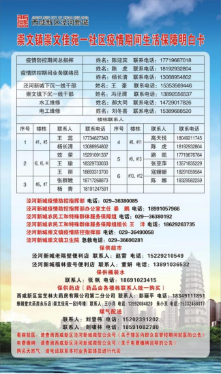 连日来,西咸新区泾河新城的广大居民陆续收到了一张非常实用的“生活保障明白卡”,菜店、超市、保供药店,买水、买电、新城和镇疫情防控指挥部电话等等诸多疫情期间的便民信息一应俱全。